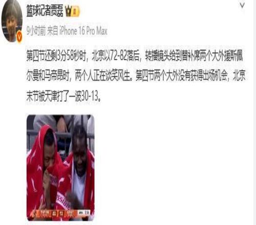 这不?不知道大家注意到了没有,比赛进行到末节还有3分58秒时,北京队落后10分,是北京队最危难的时刻,也是最揪心的时刻。然而此时板凳上有两人在谈笑风生,完全不顾场上的险情,这是不是比当年中国男篮偷笑门还奇特。没错,这两人就是在末节被摁在场下,一分钟也没打的斯佩尔曼和马帝昂。按理此时他俩应该为球队着急才是,哪有心情谈笑风生?可见北京队的人心散了,没有多少人关心输赢,关心的只是自己的收入。